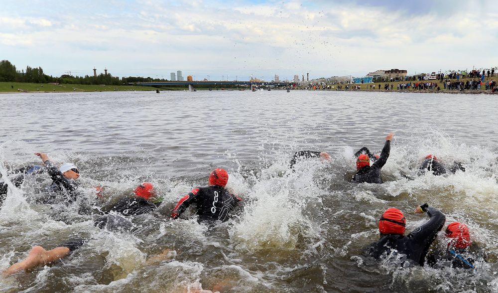 Athletes will start their race with a jump from a pontoon platform on the water into the Ishim River to tackle the 3,8 km (2.4 mile) swim course. With an average temperature of 18 to 22 degrees Celsius (64,5 to 72 Fahrenheit) and slow flow rate, participants can expect fast swim times.